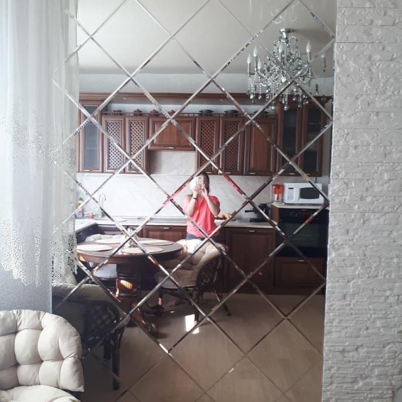 Использована серебристая квадратная зеркальная плитка размером 18х18.